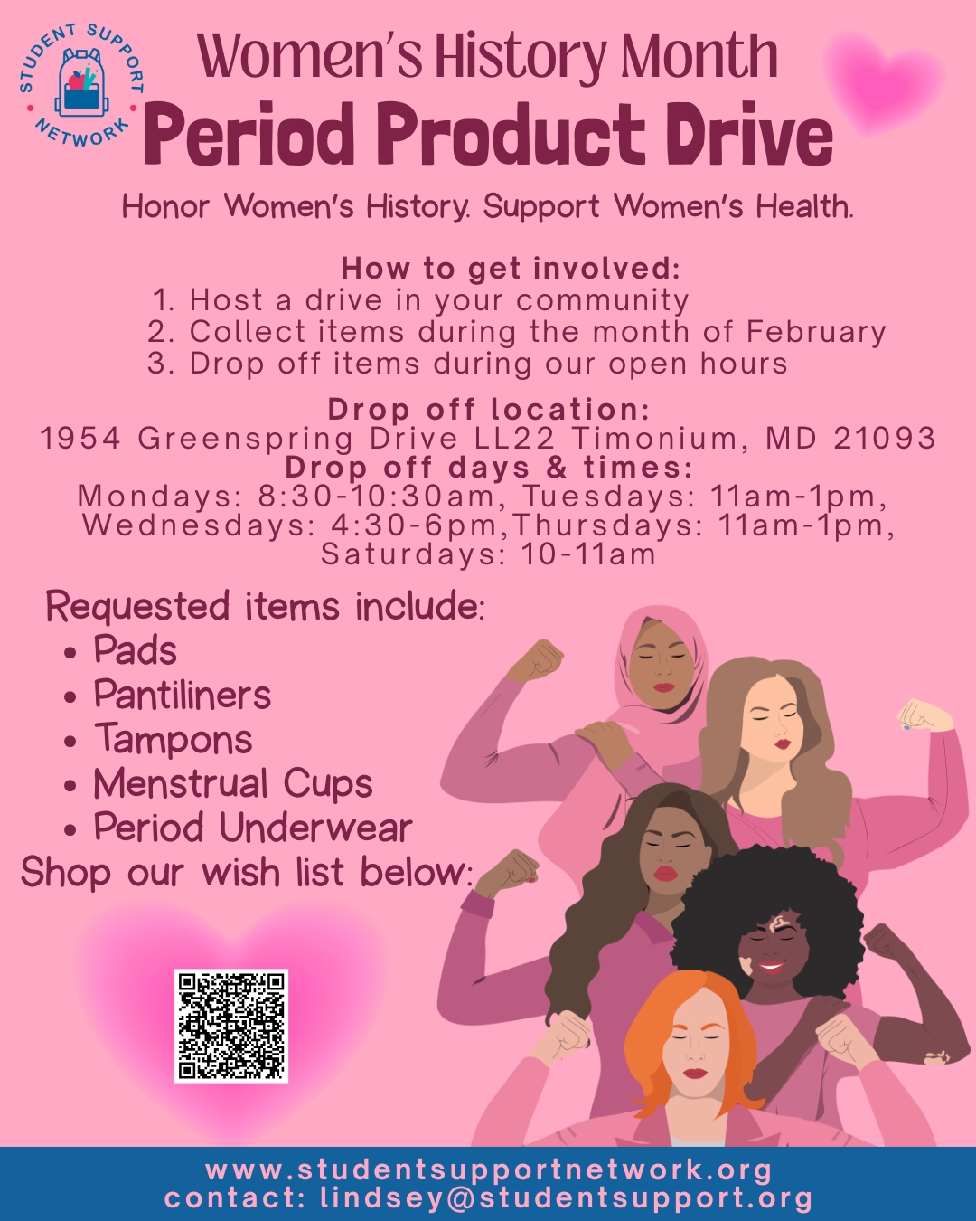 In recognition of Women’s History Month, we’re hosting a Period Product Drive to support students who lack access to essential menstrual supplies.